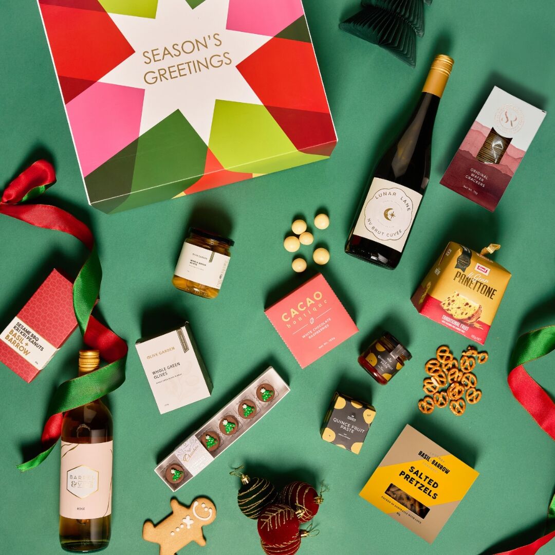 This hamper comes presented in a premium white gift box, tissue paper and finished with a ‘Season’s Greetings’ sleeve.